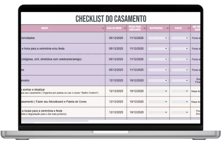 Você vai entender de forma didática e prática cada etapa do planejamento e ser guiada desde os primeiros passos até a contagem regressiva para o seu grande dia!