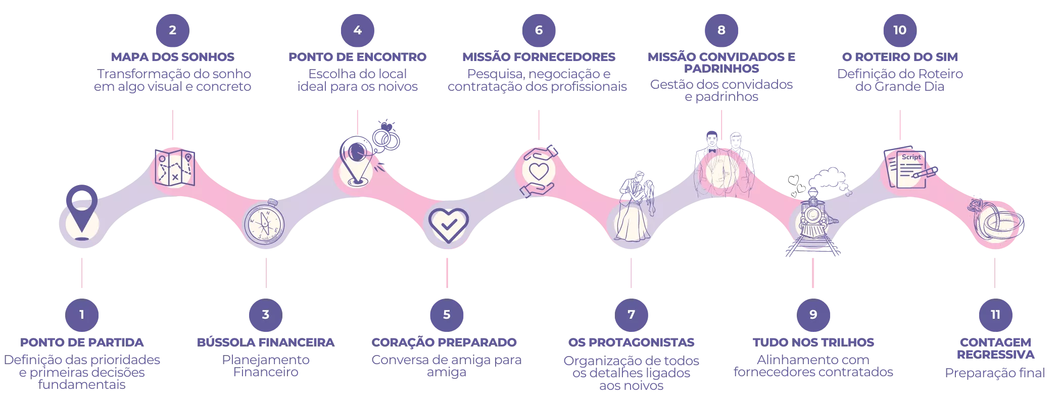 Em 11 passos você é conduzida a entender, escolher e planejar com consciência e autonomia, sabendo por que cada decisão é a melhor para o seu casamento. Nosso método te torna mais segura e preparada, evitando erros, ansiedade e decisões às cegas, seja por impulso, modismo ou pura tradição.